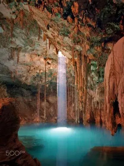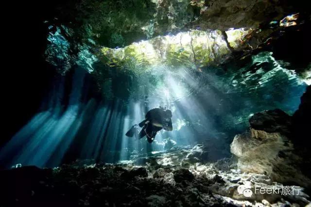 尤卡坦半岛有着不少神秘的水下洞穴,巨大的钟乳石或石笋,兼具神秘感历史感的热带雨林等,都吸引着众多的潜水爱好者前来。其中最出名的水下死亡洞穴Cenote Angelita,被称作是海底流淌的河,这里各种地质奇观和多样化的气候创造出独一无二的生态景观,被称作世界上最美的潜水之地。入口还有警示牌潜水爱好者,进入此地要做好面对死亡的准备。