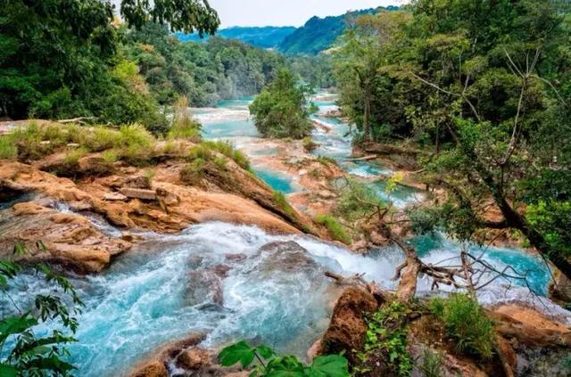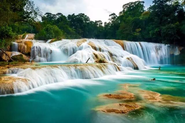 位于热带丛林中的蓝水瀑布(Agua Azul),由于水质富含矿物,因此呈粉蓝色,尤其是在山脚下的瀑布水潭在阳光的照射下,清澈晶莹,蓝得非常漂亮。沿着河水逆流而上,这条河台阶较多,落差不大。山上的水流没有那么湍急,很多地方都是缓缓而流的。到达山顶可以看到几个平缓碧绿的池水。